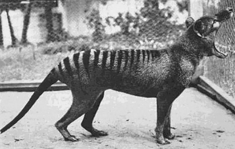 Последний живой тасманский волк зевает в зоопарке Хобарта в Австралии, 1933 год