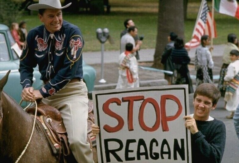 Рональд Рейган с протестующим во время избирательной компании на пост губернатора. США, 1966 год Рейган откровенно смеётся, глядя на протестанта с плакатом «Остановите музыку Рейгана»