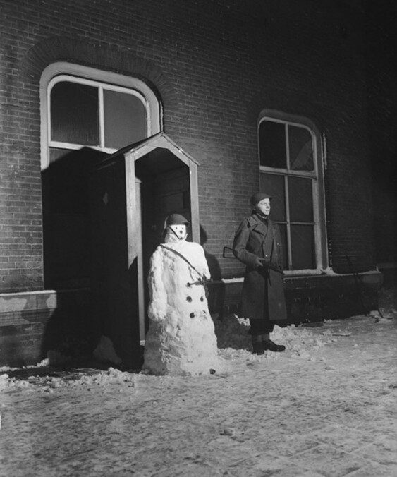 Солдат и снеговик стоят на посту. Голландия, 1946 год