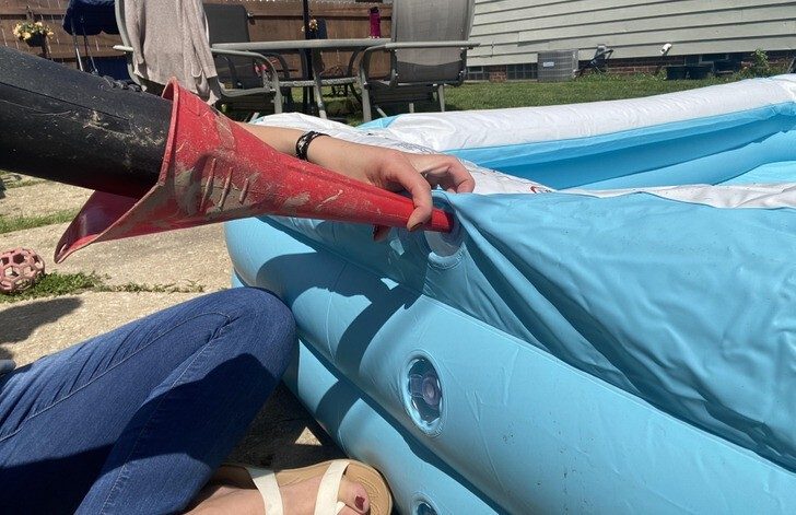 Девушка использовала воздуходувку для листьев и воронку, чтобы быстро надуть бассейн