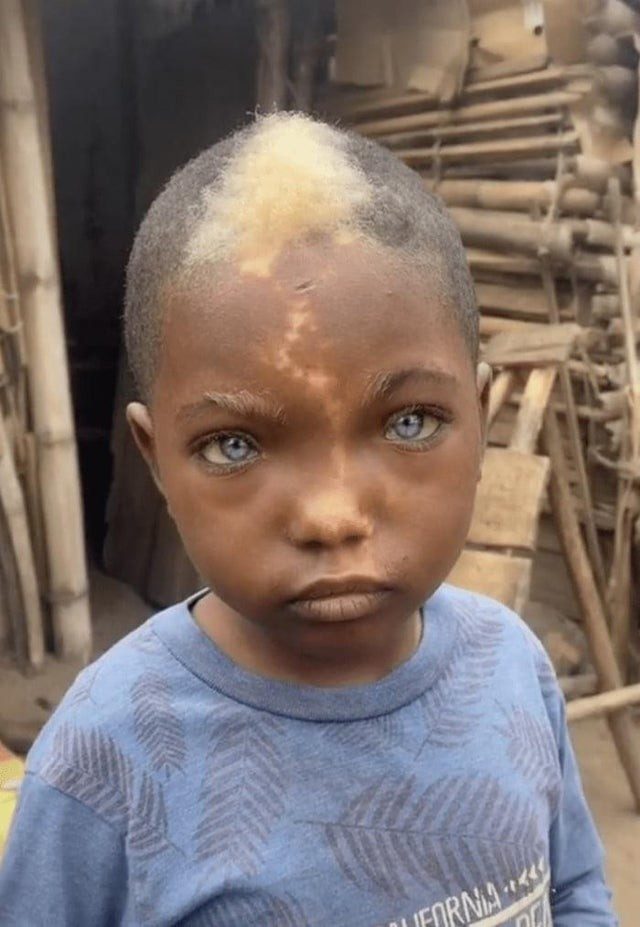 Ребенок родился с естественными белыми волосами на лбу, голубыми глазами и отметиной в виде молнии на лице