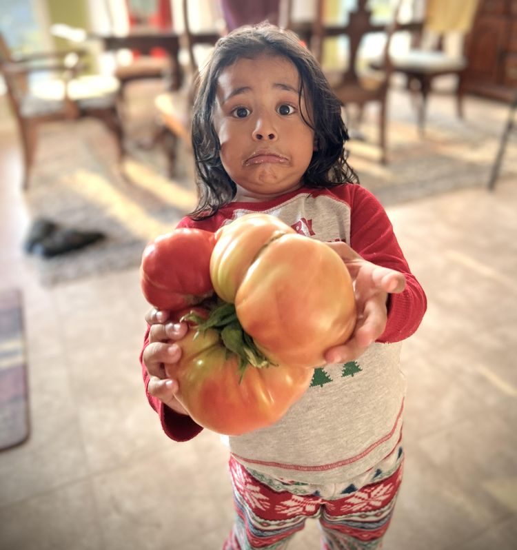 «Моя дочь хвастается большим помидором из нашего собственного огорода»
