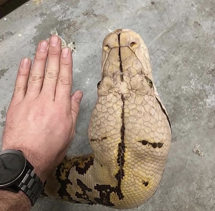 Голова сетчатого питона по сравнению с мужской рукой. Это самые большие змеи в мире, вырастающие до 7,5 метров в длину