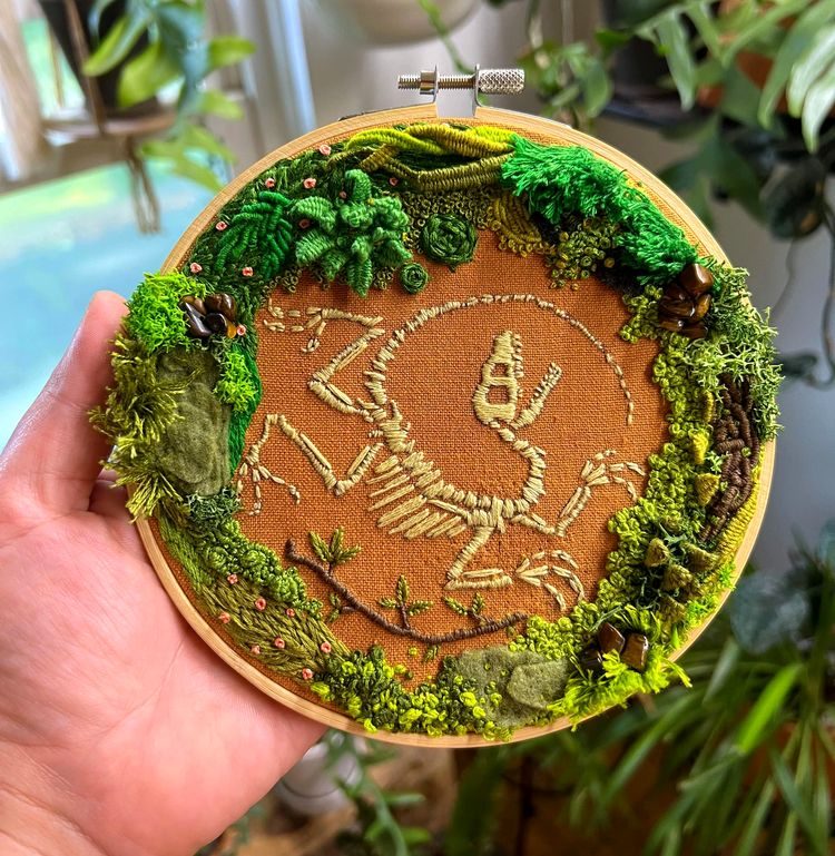 «Я добавила последние штрихи и вышивка со скелетом динозавра готова!»
