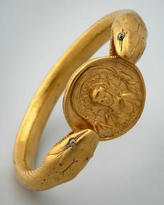 Браслет, давший название известному дому в Помпеях: «Дом золотого браслета». Двуглавая змея со стеклянными глазами держит медальон с изображением Дианы