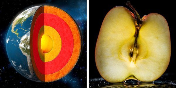 Мы живем на кожуре яблока. Толщина земной коры по сравнению со всей планетой пропорциональна кожуре по сравнению с целым яблоком