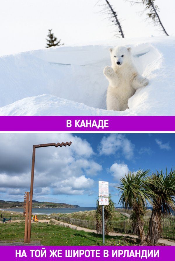 Пальмы растут в Ирландии, на 53-м градусе северной широты. В Канаде на 55-м градусе северной широты водятся белые медведи
