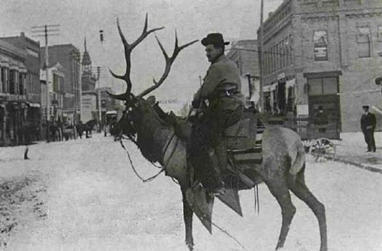 Мужчина едет на олене по городу, Канада, 1900 год
