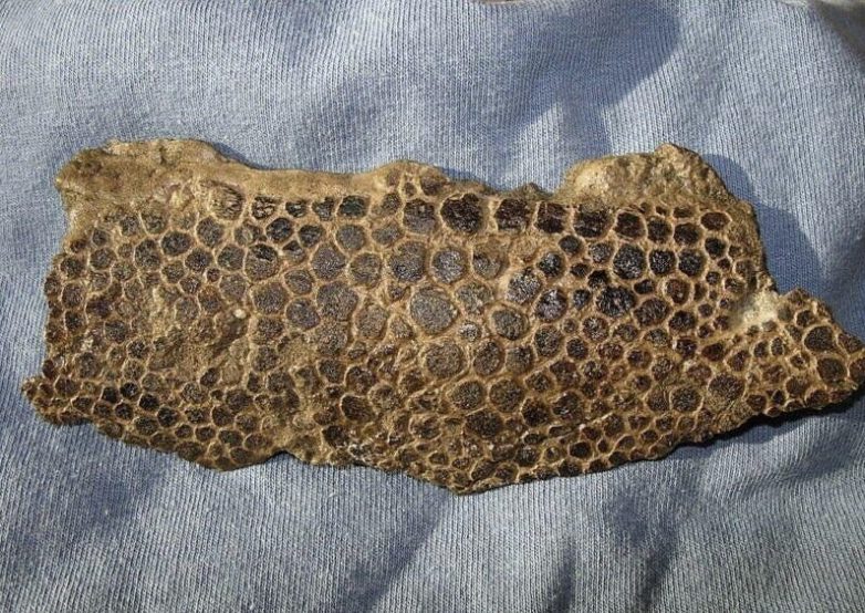 Это кусок мумифицированной кожи эдмонотзавра, выкопанный в Монтане, США