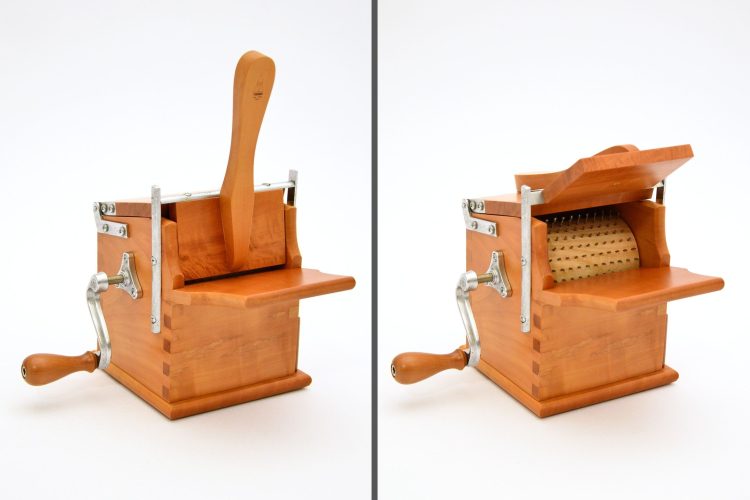 Дверца открывается, внутрь помещается кусок сыра, после чего он прижимается той же дверцей. Затем нужно просто крутить ручку и собирать мелкие кусочки сыра, который падают в нижнюю часть тёрки.