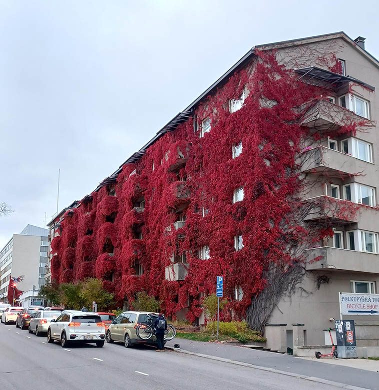 3. Плющ, который укрыл фасад дома, осенью стал не желтым, а багровым