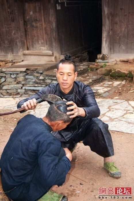 Для создания прически, китайцам совсем не нужны парикмахерские инструменты и салон. Стрижка серпом или раскалёнными щипцами — обычное дело. Во время такой стрижки легко можно остаться без уха