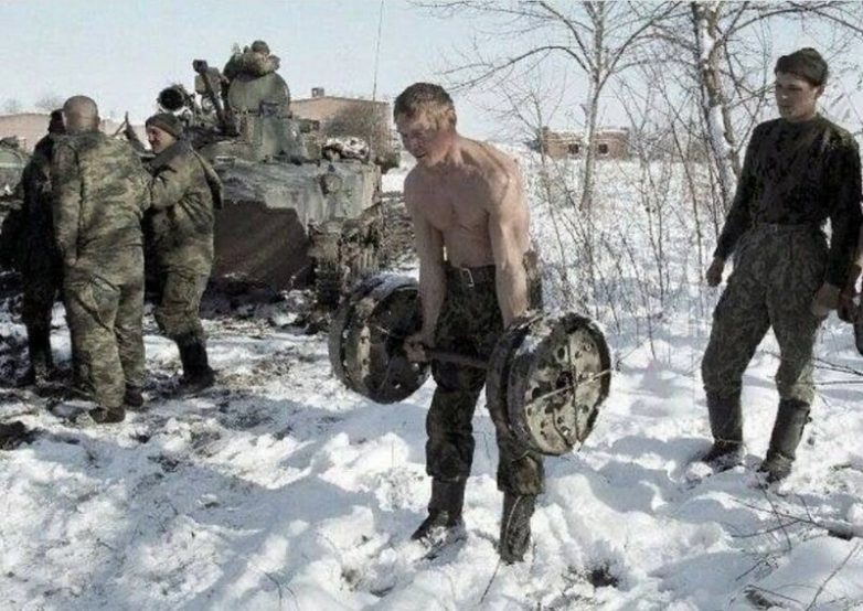Утренняя зарядка бойцов ВДВ в Чечне, БМД-2 и импровизированная штанга из изношенных катков 1999 год