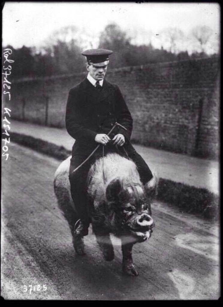Мужчина верхом на свинье в зверинце Уэйгфилда, Англия, в 1903 году