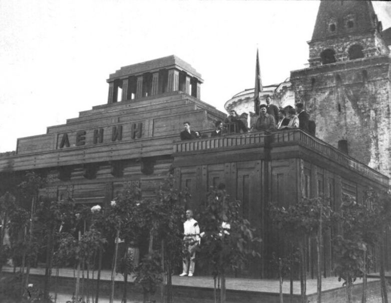 На Красной площади. Неизвестный автор, 22 июля 1925 года, г. Москва. Под знаменем на первом плане – Лев Троцкий.