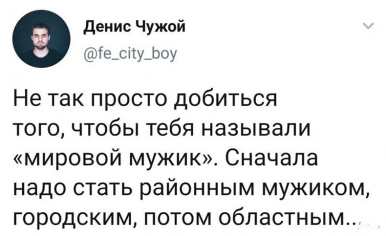 Чтобы стать районным мужиком, надо сначала стать местным мужиком)))