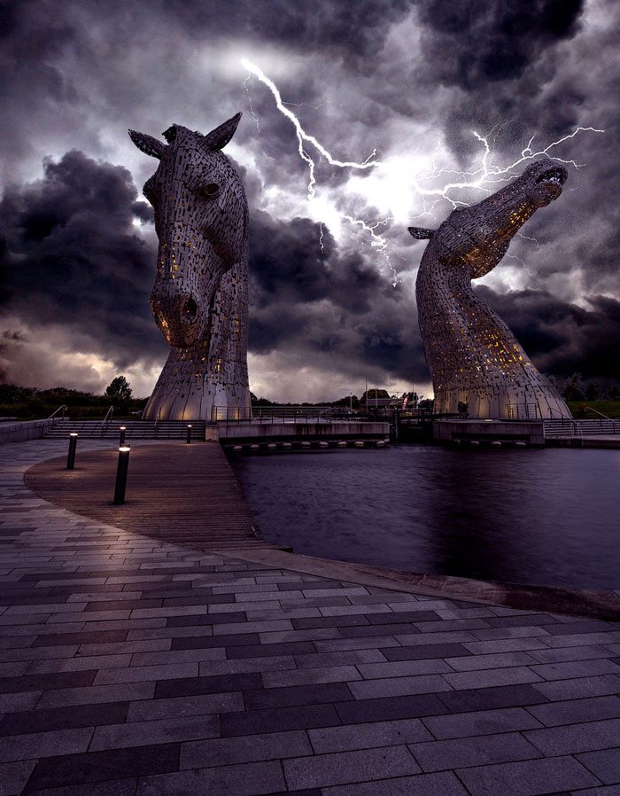 Келпи — скульптуры голов лошадей, расположенные рядом с рекой Каррон, Шотландия