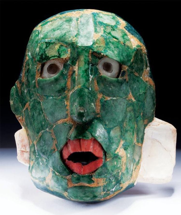 То, что на фотографии — это «творчество» мексиканских археологов.Оригинальная основа из растительных смол истлела, и они наклеили пластинки жадеита и цветных раковин на то ли гипс, то ли раствор, как смогли (а смогли не очень). Даже самая известная паленкская маска, из саркофага в «Храме Надписей», как ее первоначально склеили, мало походила на изображения похороненного там Кинич Ханааб Пакаля, позже её переделали, стала похожа. Так что капитан Гнездилов здесь ни при чем.