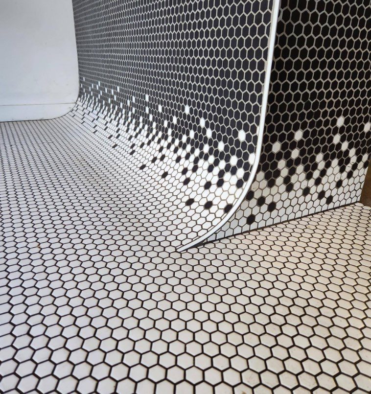 1. Плитка в магазине сэндвичей уложена не под прямым углом, а сделана с плавным переходом. В сочетании с орнаментом выглядит это превосходно.