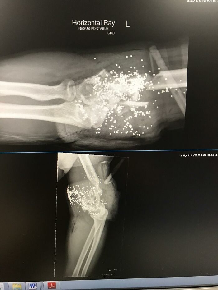 10. Последствия выстрела в локоть из дробовика 12-го калибра на рентгеновском снимке