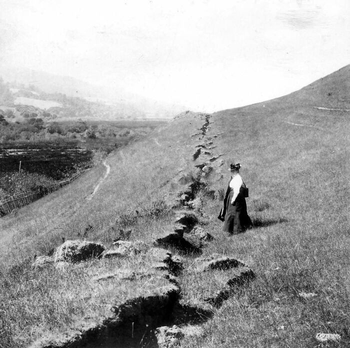 Известный ботаник Элис Иствуд осматривает трещину, оставшуюся после землетрясения 1906 года около Олемы, Калифорния