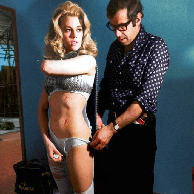 Роже Вадим поправляет одежду Джейн Фонды во время съемок фильма «Барбарелла», 1967 год