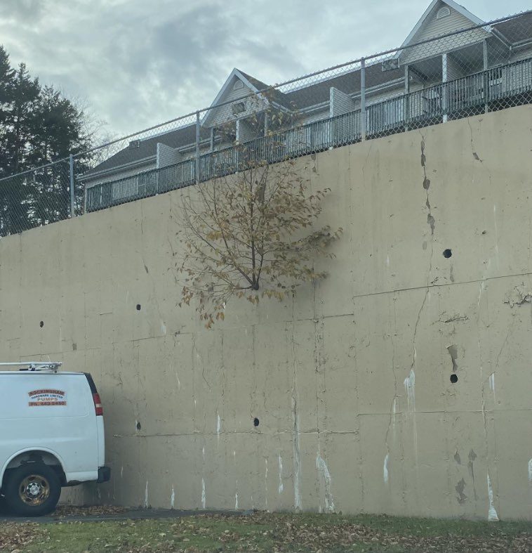 3. Уникальное явление — дерево растет из дренажного отверстия опорной стены