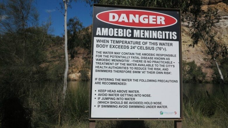 В некоторых местах здесь и вода опасна. Вот, объявление у пресного водоёма предупреждает, что в воде могут содержаться амебы, вызывающие амебный менингит — редкое заболевание, которое может иметь фатальный исход
