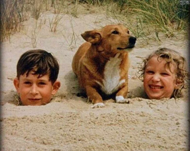 Принц Чapльз и принцесса Aннa зарыты в песке на пляже. Великобритания, 1957 год