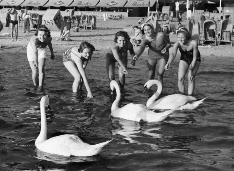 Женщины кормят лебедей на озере Ванзее. Германия, 1939 год