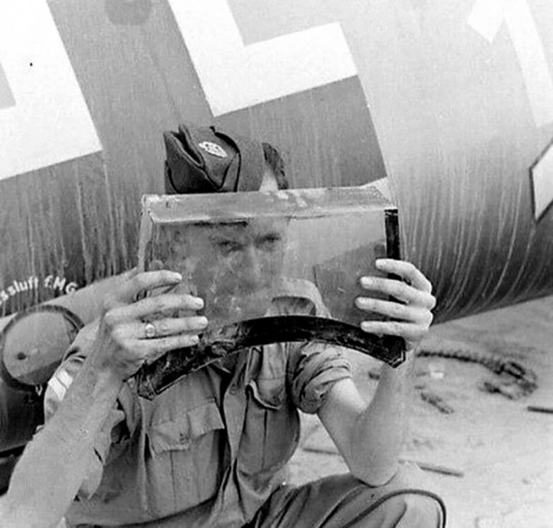 Британский авиатехник демонстрирует толщину лобового бронестекла «Мессершмитт» Bf 109Е. Вторая мировая
