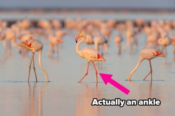 Возможно, вы считаете, что у фламинго колени смотрят назад. На самом деле, то, что смотрит назад, — это лодыжка. Настоящее колено фламинго расположено намного выше на его ноге и скрыто телом и перьями.