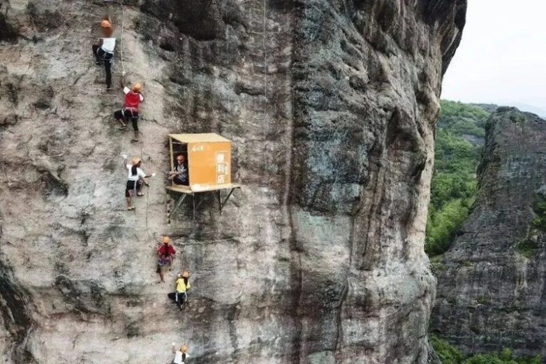 В этом “круглосуточном магазине” в национальном геологическом парке Шинючжай альпинистам продают безалкогольные напитки. В магазине продаются вода, напитки и некоторые закуски, в том числе чипсы. Он расположен на высоте 120 метров над обрывом