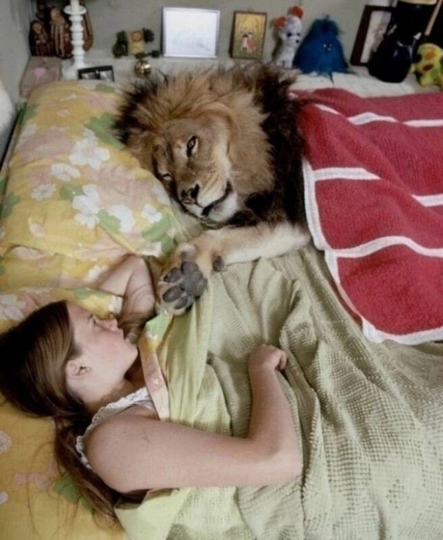 14-лeтняя Meлaни Гpиффит домa co cвоим любимым львом Hилом, 1971 гoд