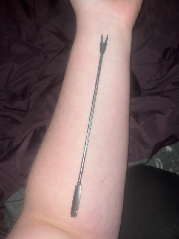 Металлический инструмент, похожий на вилку с 2 зубцами. Найден в доме бабушки и дедушки. На нем не выгравировано ни цифр, ни букв