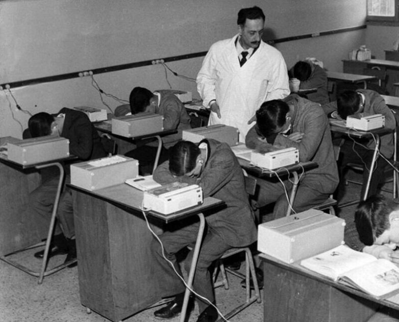 Эксперимент по обучению стyдентoв под гипнoзoм. Учeники введены в трaнс и слушают через наушники запись урокa, Италия, 1963 год
