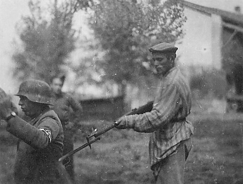 Недавно освобожденная жертва Холокоста ведет своего бывшего надзирателя, 1945 год