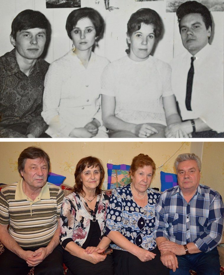 1. Разница между этими фотографиями, на которых запечатлены две семейные пары, составляет целых 40 лет. Все, конечно постарели, но радует то, что они находят время, чтобы собраться вместе.