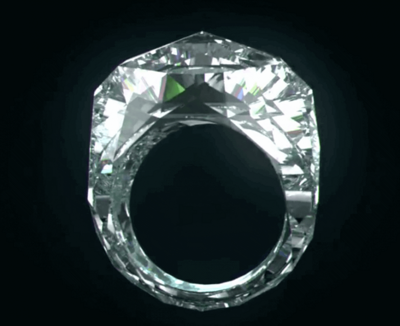 Это кольцо является не только одним из самых дорогих в мире, но и невероятно удивительным, так как оно выполнено из цельного бриллианта. На его производство ушло много сил и времени, так как художники и дизайнеры столкнулись с рядом трудностей при разработке чертежей и схем будущего кольца.