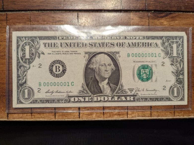 Эту долларовую купюру 1969 года мы нашли в небольшой коллекции денег моего отца с серийным номером 00000001