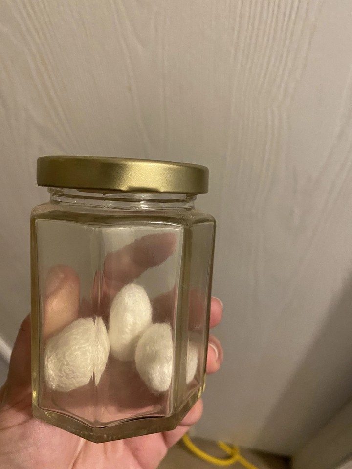 13. “Нашла эту банку в шкафу с книгами, когда убирала в офисе. Внутри что-то похожее на мягкие ватные шарики. Что это может быть?”