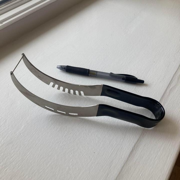 2. “Похоже на какой-то кухонный инструмент. Может сжиматься как щипцы. Сделан из металла, а ручки из пластика.”