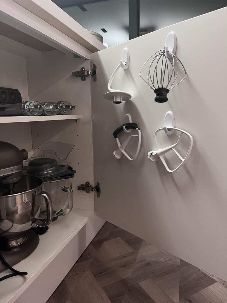 13. “Прикрепила на дверцу крючки для хранения деталей от миксера и других подобных приборов. Их у меня не много, но мне все равно нравится, как это теперь выглядит.”