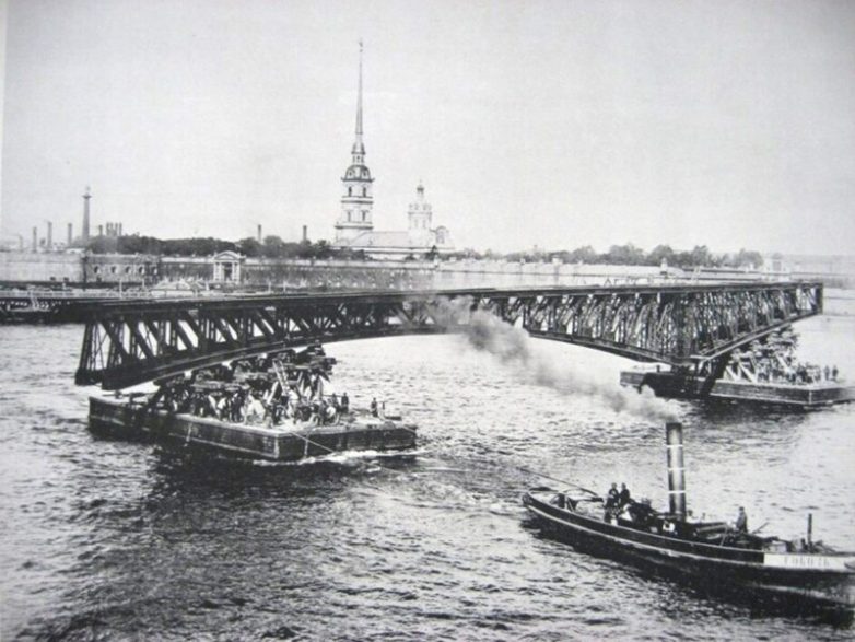 Строительство Троицкого моста в Петербурге 1901 год. Перевозка ферм левого крайнего пролета