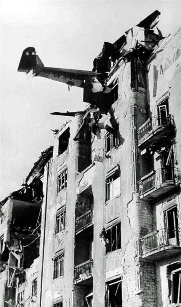 Обломки немецкого планера DFS-230 унтер-офицера Георга Филиуса, который врезался в стену жилого дома №37 по улице Аттилы при попытке приземлиться на Кровавом лугу во время битвы за Будапешт 4 февраля 1945 года. Пилот планера погиб. На планерах DFS-230 пытались доставлять продовольствие и боеприпасы окруженной немецкой группировке в Будапеште