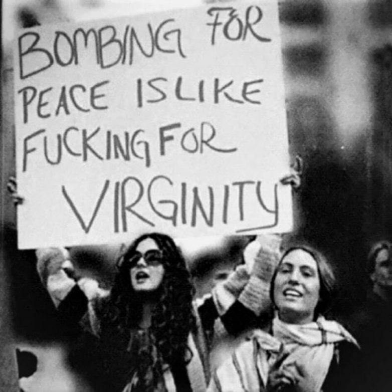 «Бомбить ради мира — всё равно, что заниматься сексом ради девственности» — знаменитый лозунг, используемый хиппи во время акций протеста против войны во Вьетнаме, 1960-е.