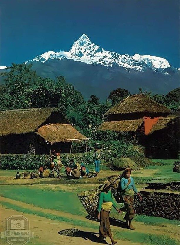 Деревенская сцена в Покхаре на фоне горы Мачхапухре. Открытка 1970-х годов от Hotel Crystal | Фото Шридхара Л. Манандхар