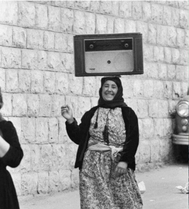 Женщина переносит радиоприёмник. Палестина, 1959 год