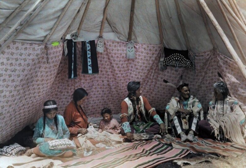 Семья индейцев в своем жилище, типи. Монтана, 1927 год. Автор фото Эдвин Л. Вишерд