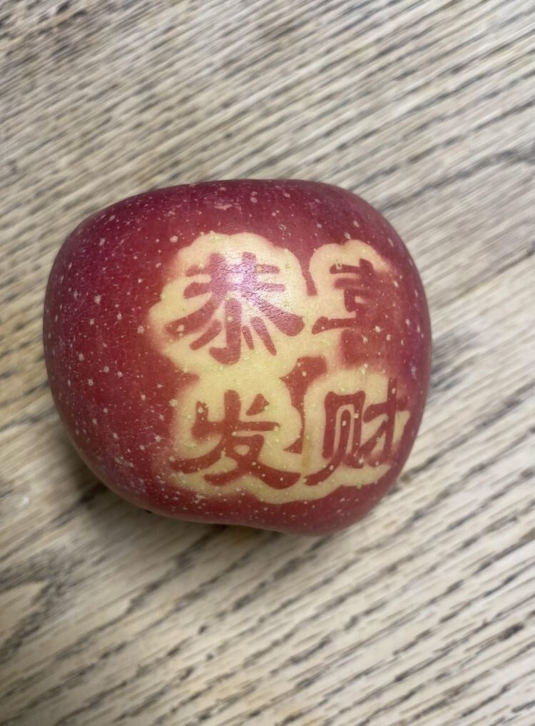 Никакой магии, это делается с помощью наклеек. Там, где солнечный свет попадает на яблоко, оно красное, а там, где оно было закрыто наклейкой, оно остается светло-желтым. Кстати, на яблоке написано: «Желаем вам богатства и процветания», что является обычным поздравлением с Китайским Новым годом. В Китае во время празднования Лунного Нового года не говорят «Счастливого Нового года!», вместо этого они желают друг другу богатства.